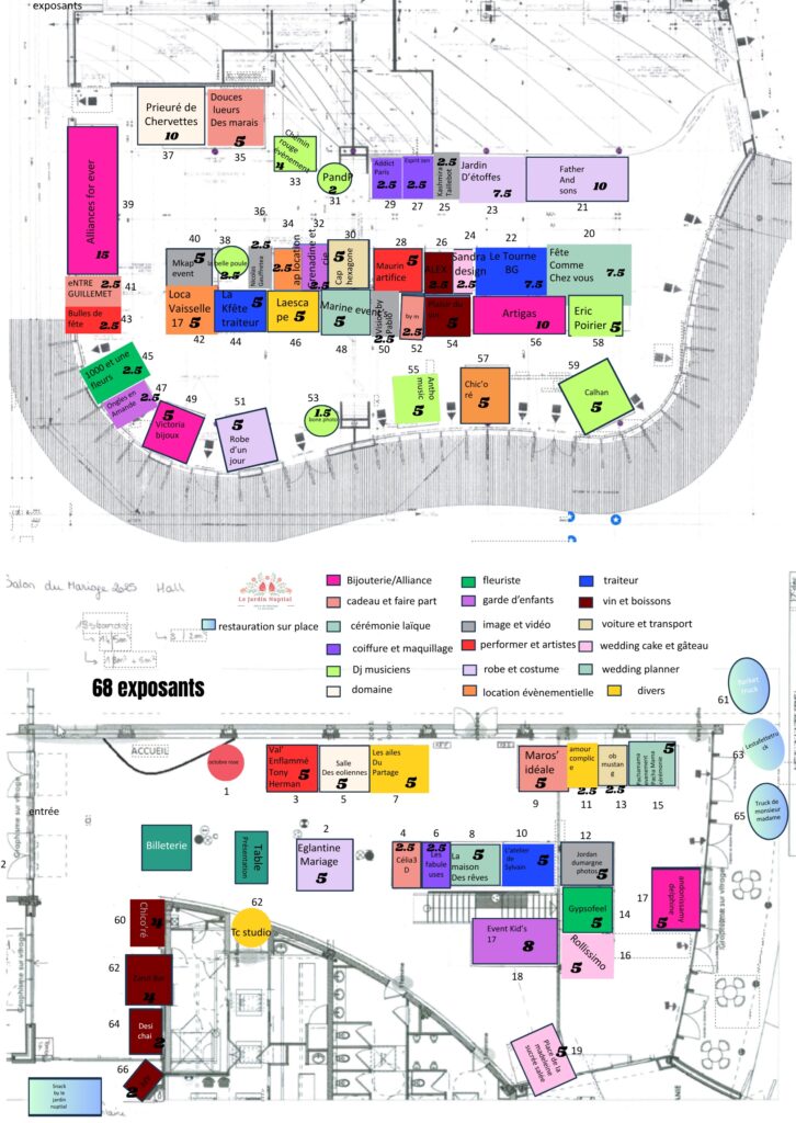 Consultez le plan détaillé du salon pour retrouver facilement l’ensemble des exposants et leurs catégories. Que vous recherchiez une robe de mariée, un photographe, un traiteur ou une animation, ce guide vous permettra d’organiser votre parcours et de ne rien manquer lors de votre visite au Salon du mariage Jardin Nuptial à La Rochelle.